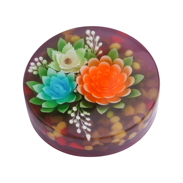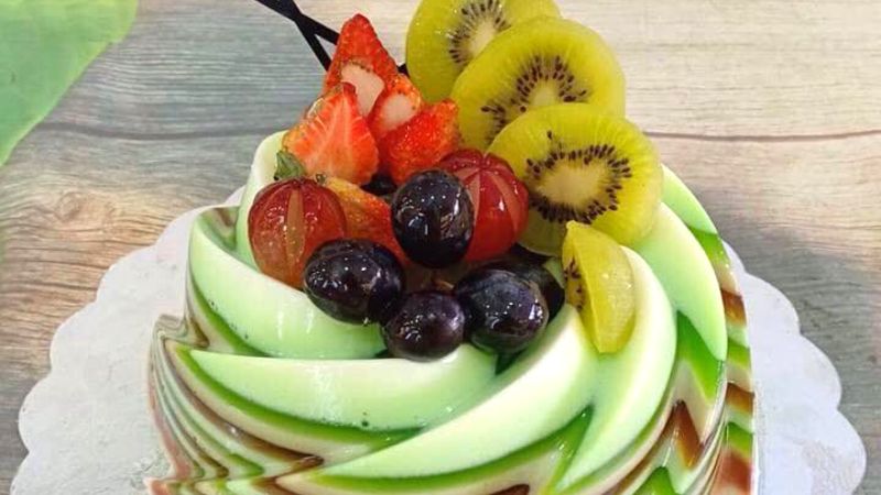 Lớp Phủ Cuối Cùng: Đổ một lớp rau câu trong suốt (nấu từ Hoàng Yến, không màu) mỏng lên trên cùng để cố định và làm bóng các chi tiết trang trí.